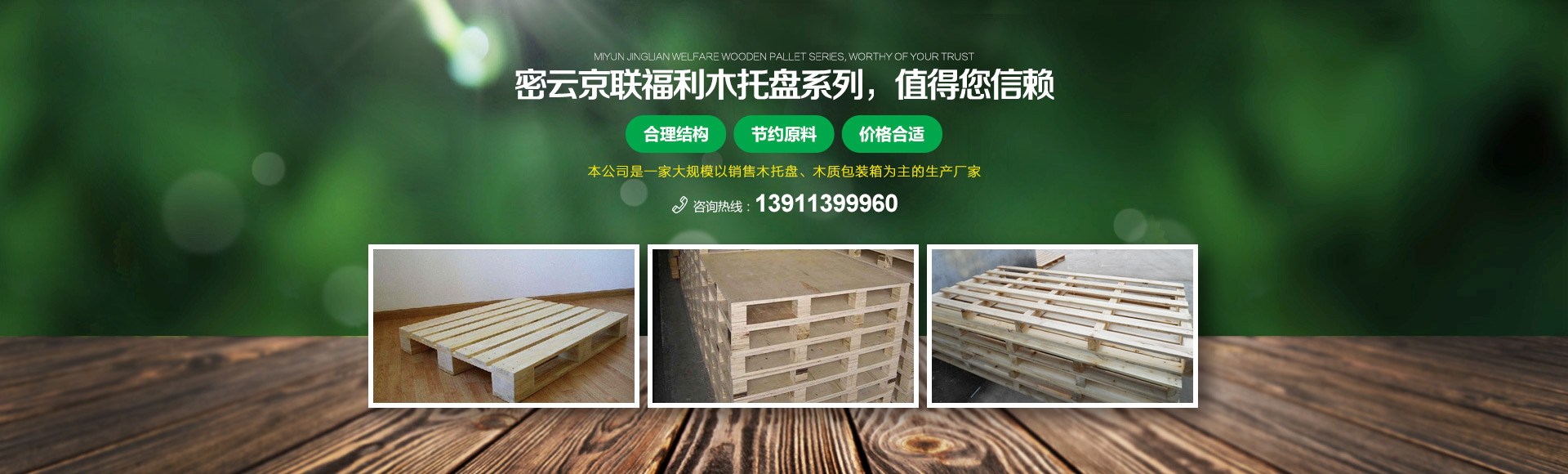 北京京聯(lián)國(guó)順木制品有限公司 (原北京市密云縣京聯(lián)福利木制品廠)成立于1993年,位于北京市密云縣西田各莊鎮(zhèn)蒼頭村,占地約5000平米。我公司工廠是一家大規(guī)模以銷售木托盤為主的生產(chǎn)廠家。本工廠是一家直接采購(gòu)原木,按客戶要求生產(chǎn)規(guī)格尺寸的托盤,我公司工廠位于河北省承德市有著木材加工點(diǎn),可以做到,從山上的木頭下山到客戶手中的托盤都是一手貨,減少了中間商的費(fèi)用,所以我公司售出的產(chǎn)品對(duì)北京這個(gè)龐大的市場(chǎng)來(lái)說(shuō)在同樣的規(guī)格尺寸的托盤來(lái)說(shuō)價(jià)格比較占優(yōu)勢(shì)。